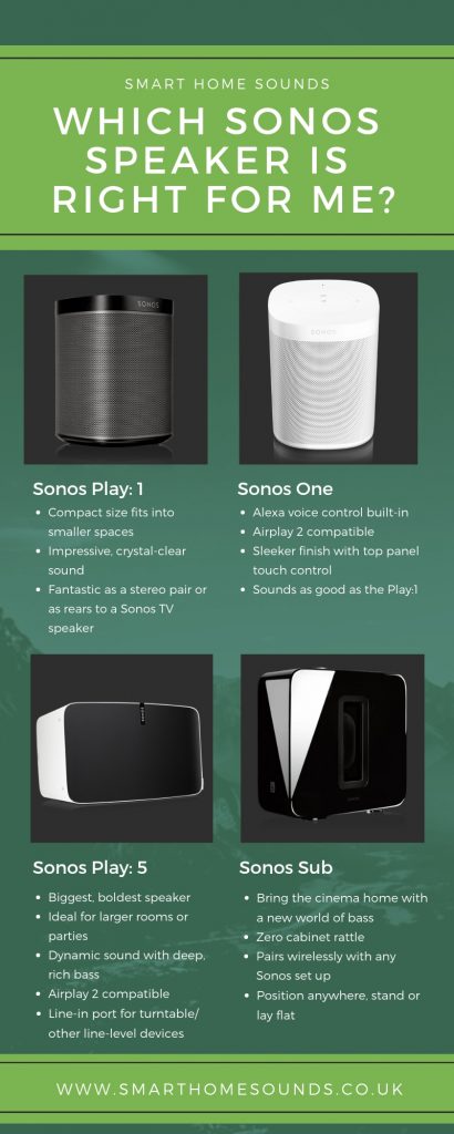 Can't decide between, the Sonos One or PLAY:1 or do you need the extra bass of a PLAY:5. Please see below for a handy infographic to help you decide which is the right Sonos smart speaker for you.