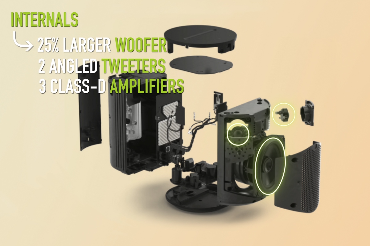 They’ve also made this a stereo speaker with a dual tweeter setup with two angled tweeters. Plus there are three class-D amplifiers powering the woofer and tweeters. Sonos have also added custom waveguides which work to help spread the sound waves to give you an even wider soundstage.